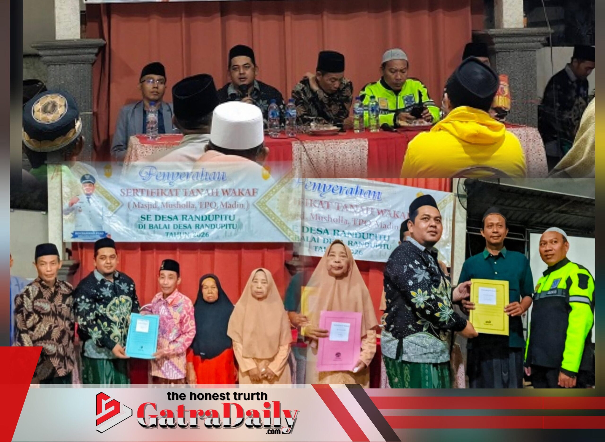 PASURUAN | gatradaily.com – Pemerintah Desa Randupitu, Kecamatan Gempol, Kabupaten Pasuruan, menyerahkan puluhan sertifikat tanah wakaf untuk masjid, musholla, TPQ, dan madrasah diniyah, Senin (26/01/2026).