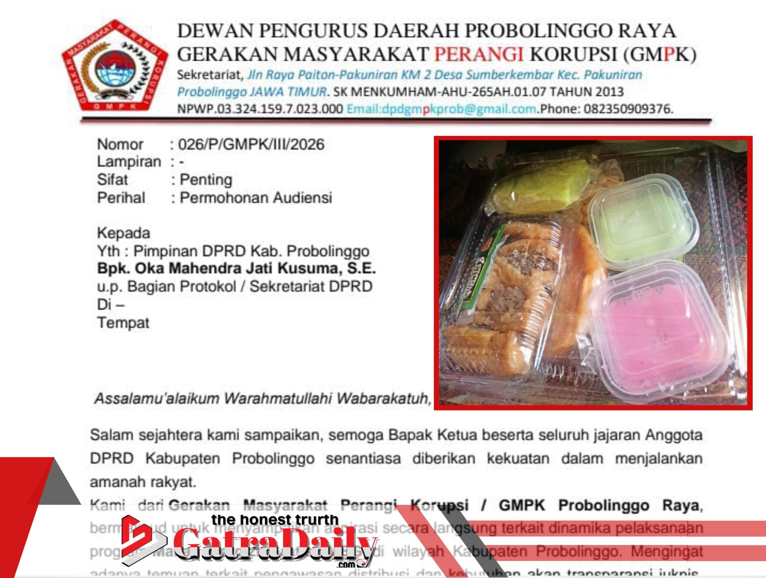 PROBOLINGGO | gatradaily.com – Gerakan Masyarakat Peduli Korupsi (GMPK) Probolinggo berencana mendatangi gedung DPRD Kabupaten Probolinggo untuk mendesak transparansi dalam pengelolaan Program Makan Bergizi Gratis (MBG).