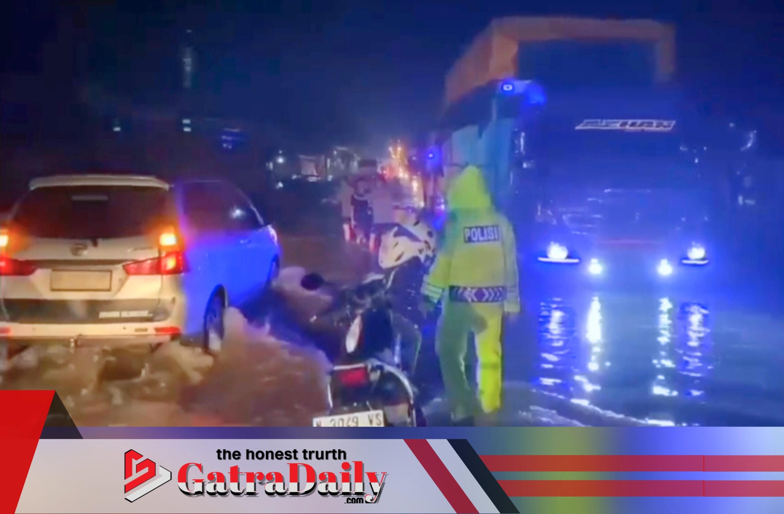 Pengendara terpaksa melambatkan laju kendaraan karena genangan menutup sebagian badan jalan.