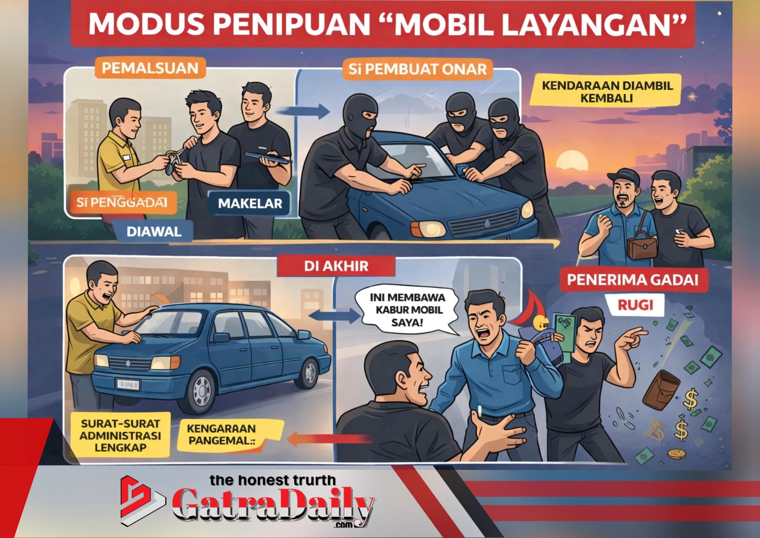 Ilustrasi modus “mobil layangan”, skema penipuan terstruktur yang membuat penerima gadai menjadi pihak paling dirugikan.