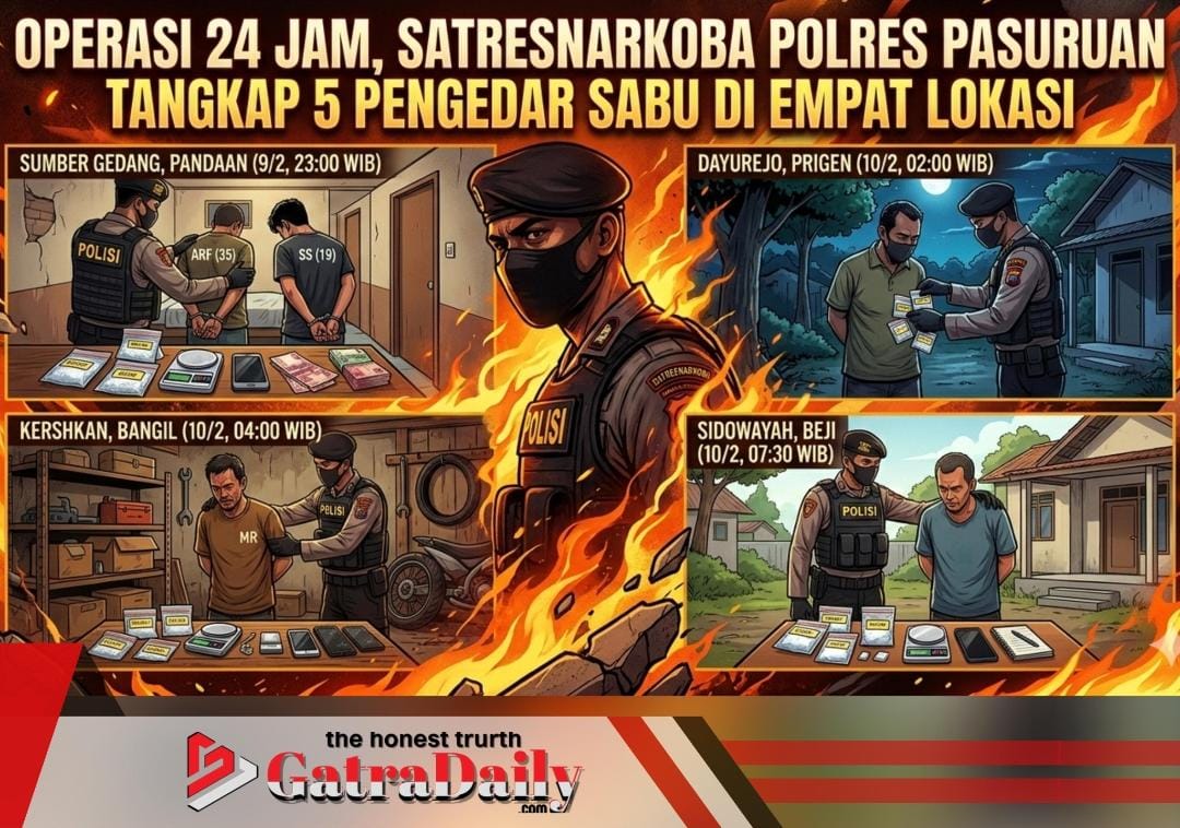 PASURUAN | gatradaily.com – Satuan Reserse Narkoba (Satresnarkoba) Polres Pasuruan menangkap lima tersangka pengedar sabu dalam operasi intensif selama 24 jam di empat lokasi berbeda di wilayah Kabupaten Pasuruan pada 9–10 Februari 2026.