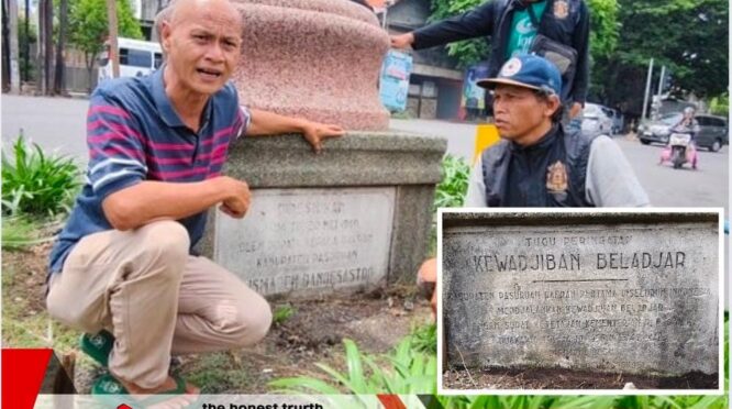 Jurnalis dan LSM Bersihkan Monumen “Kewadjiban Beladjar” Peninggalan Soekarno di Pasuruan