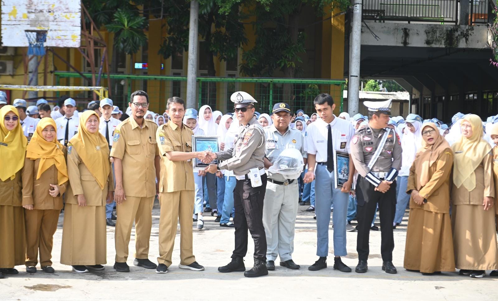 PASURUAN | gatradaily.com — Satuan Lalu Lintas (Satlantas) Polres Pasuruan bersama Jasa Raharja memberikan penghargaan kepada Haikal, pelajar SMKN 1 Bangil, atas kepatuhan dan ketertibannya dalam berlalu lintas. Penghargaan diserahkan saat upacara bendera di SMKN 1 Bangil, Senin (15/12/25).