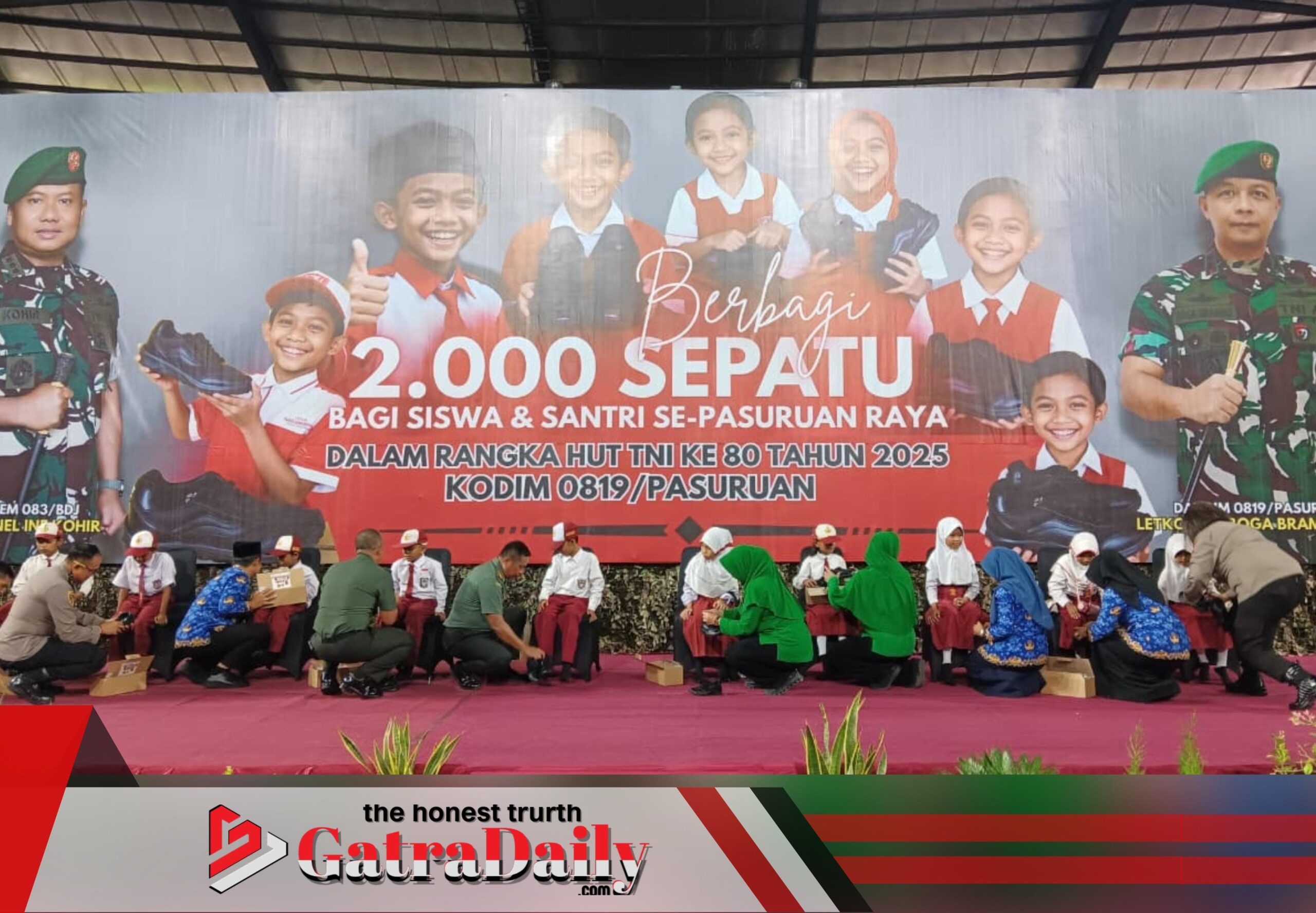 PASURUAN | gatradaily.com – Sebanyak 2.000 pelajar dan santri di wilayah Pasuruan Raya menerima bantuan sepatu baru dalam kegiatan bakti sosial yang digelar Kodim 0819/Pasuruan bersama Korem 083/Baladika Jaya, Senin (17/11/25).