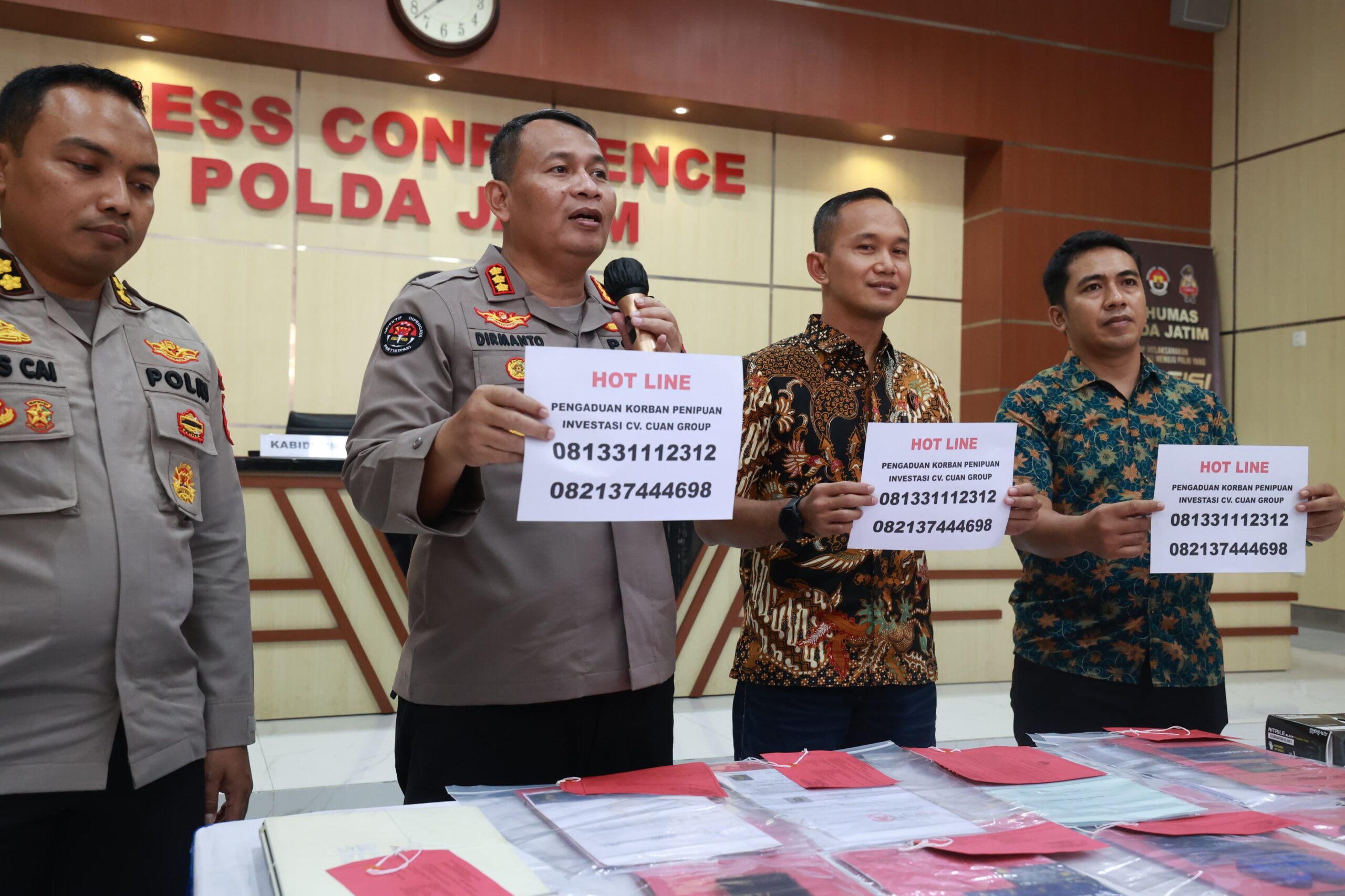 “Ketiga orang yang ditetapkan TSK tersebut adalah Direktur cuan group, kemudian yang dua lainnya adalah pengurus dari CV cuan group, terhadap tersangka sudah dilakukan penahanan sejak tanggal 3 April 2024 Polda Jawa Timur,” terangnya.
