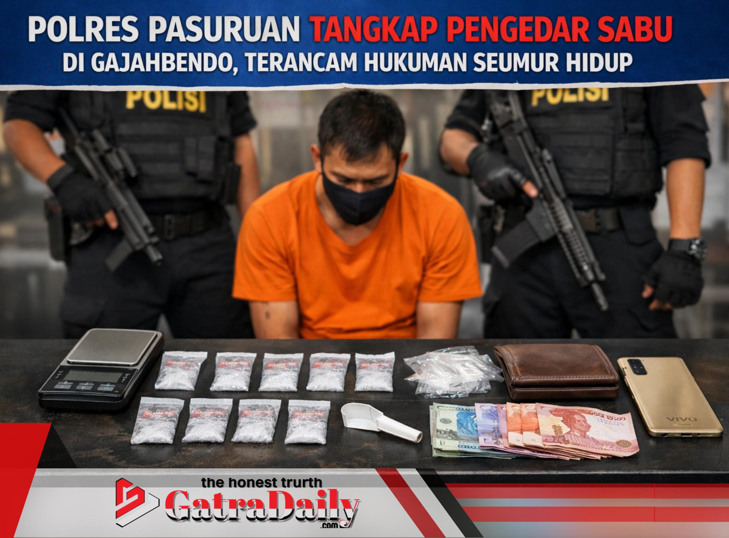 Pelaku ditangkap di sebuah rumah kontrakan di Desa Gajahbendo, Kecamatan Beji, Kabupaten Pasuruan, pada Sabtu (24/1/2026). Dari lokasi penangkapan, polisi menyita enam paket sabu dengan berat total netto 3,764 gram.