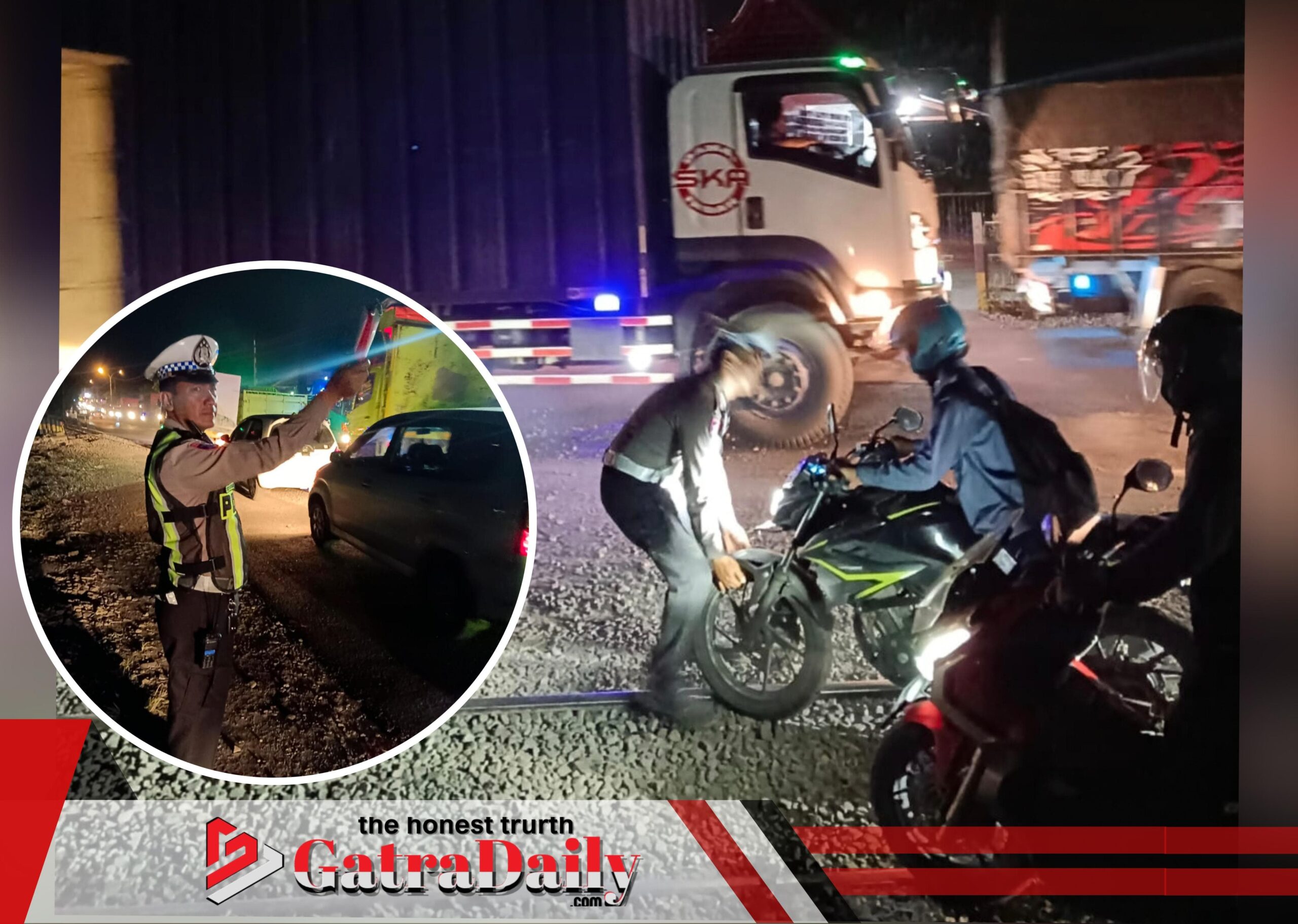 Petugas membantu pengendara yang mengalami kesulitan melintasi perlintasan, sekaligus memberikan imbauan agar tetap berhati-hati dan mengutamakan keselamatan.