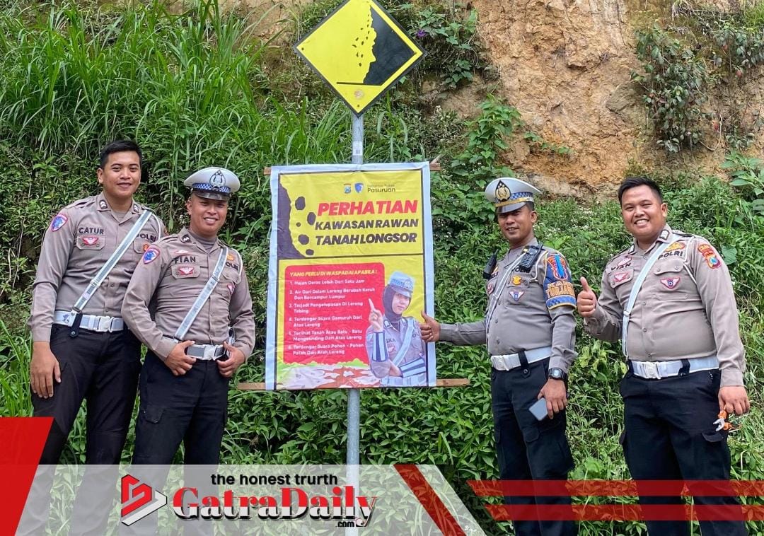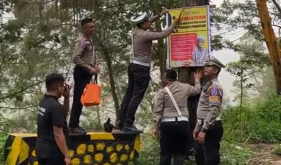PASURUAN | gatradaily.com – Satuan Lalu Lintas (Satlantas) Polres Pasuruan memasang delapan spanduk imbauan rawan longsor di sepanjang jalur wisata Tosari, Selasa (18/11/25).