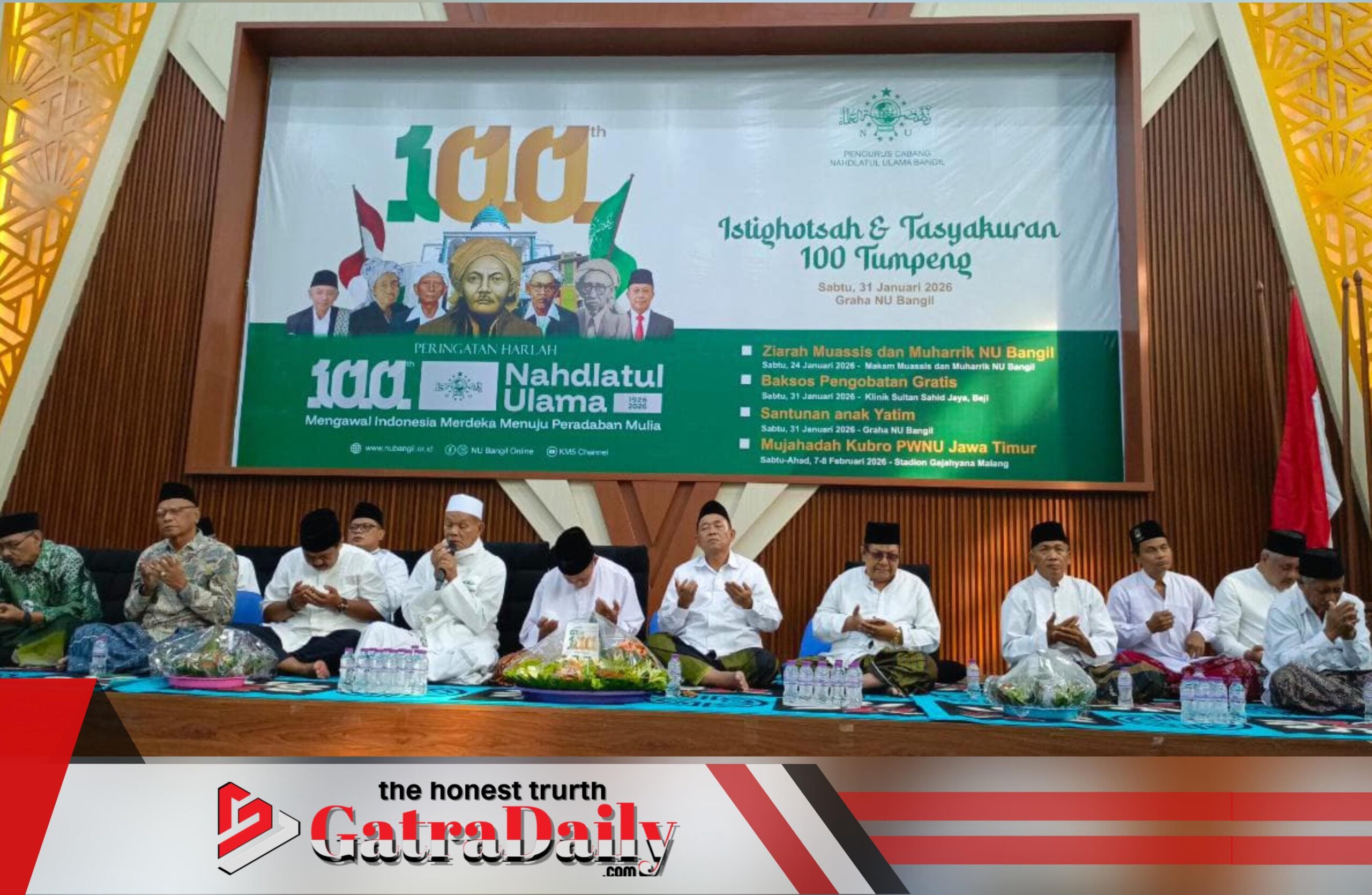 PASURUAN | gatradaily.com – Pengurus Cabang Nahdlatul Ulama (PCNU) Bangil, Kabupaten Pasuruan, memperingati satu abad berdirinya Nahdlatul Ulama (NU) dengan menggelar istighotsah dan tasyakuran 100 tumpeng, Sabtu (31/1/2026).